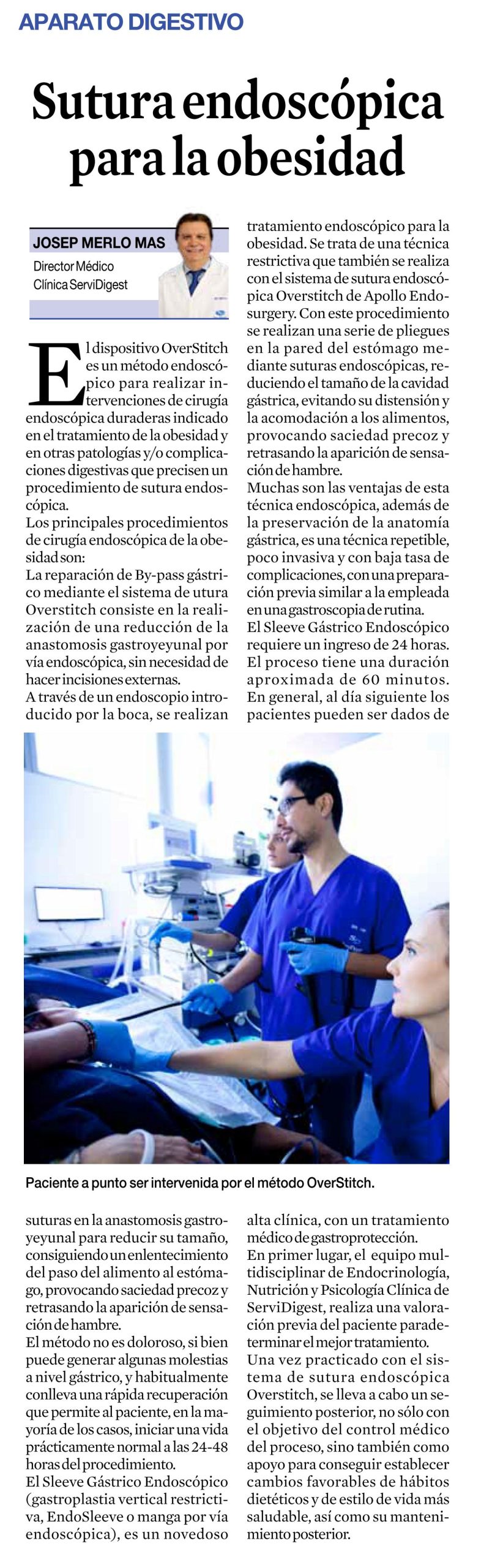 Un método novedoso y avanzado para realizar intervenciones endoscópicas por vía oral, e indicado en el tratamiento de la Obesidad y también en otras patologías y/o complicaciones digestivas que precisen un procedimiento de sutura endoscópica.